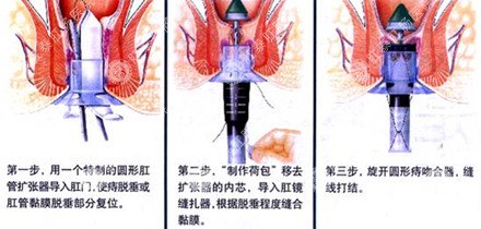 PPH微创术利用特制的圆形吻合器经肛门插入直肠,环形切除直肠下端肠壁的黏膜和黏膜下层组织,并在切除同时进行吻合,使脱垂的肛垫上提,恢复肛垫的正常解解剖位置,起“悬吊”作用,同时切断供应痔核的动脉血液分支,起“断流”作用,从而达到根治的目的。